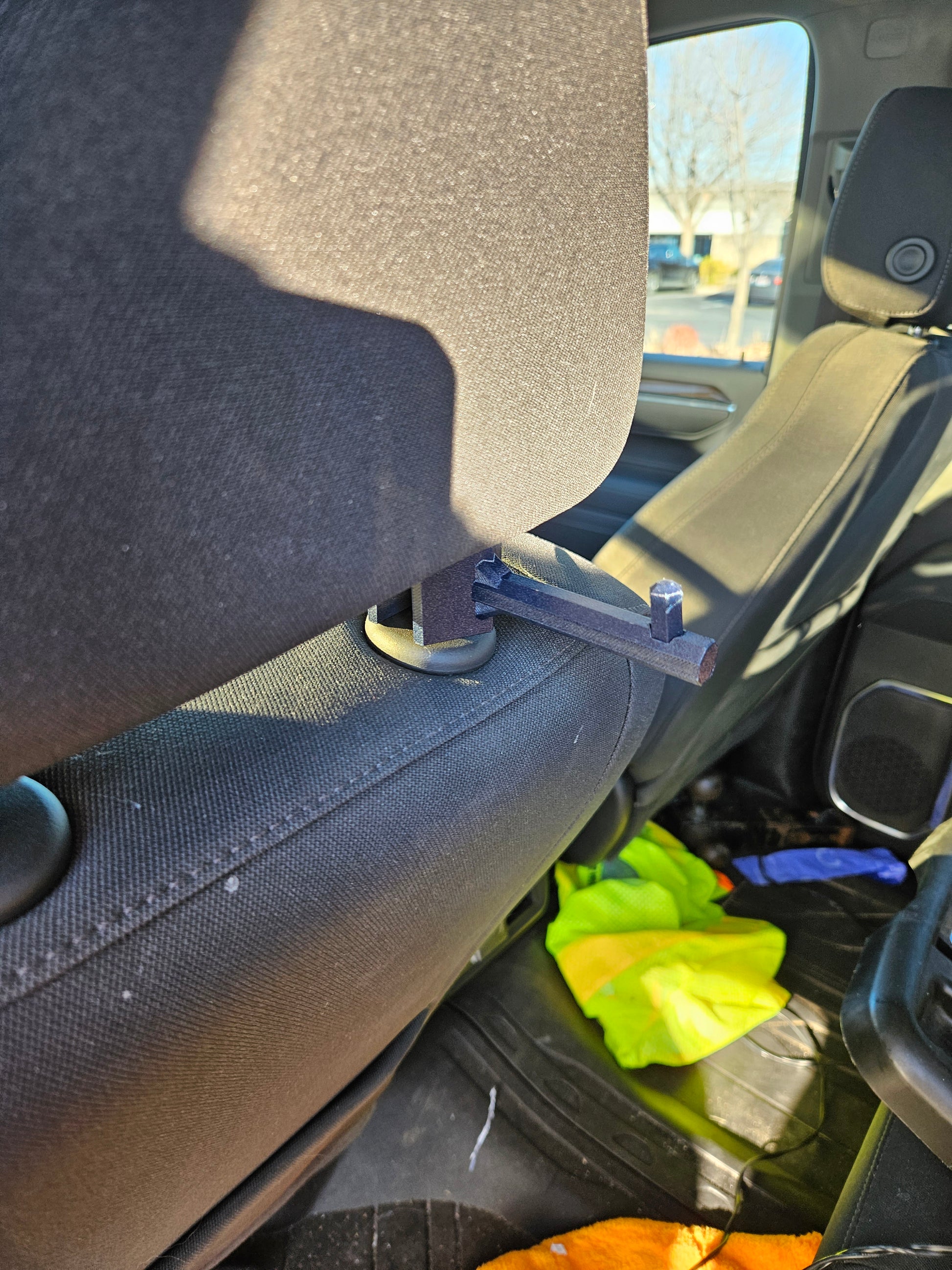 The Rig Rack is a hanger that twists on to your vehicles head rest rails. It was designed for hard hats but can be used for essentially anything. We have been testing the Rig Rack for months and are confident that it will hold anything you need kept off your vehicles seats or floors.